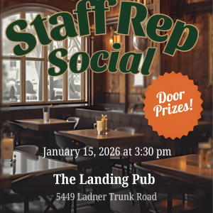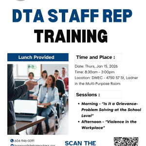 DTA STAFF REPS! The Staff Rep Social is Thursday, January 15. Come out and chat in a less formal setting. We will be at the Landing Pub & Grill in Ladner at 3:30 pm. For those of you attending Staff Rep Training that day, stay and relax afterwards. Executive Committee members will also be in...